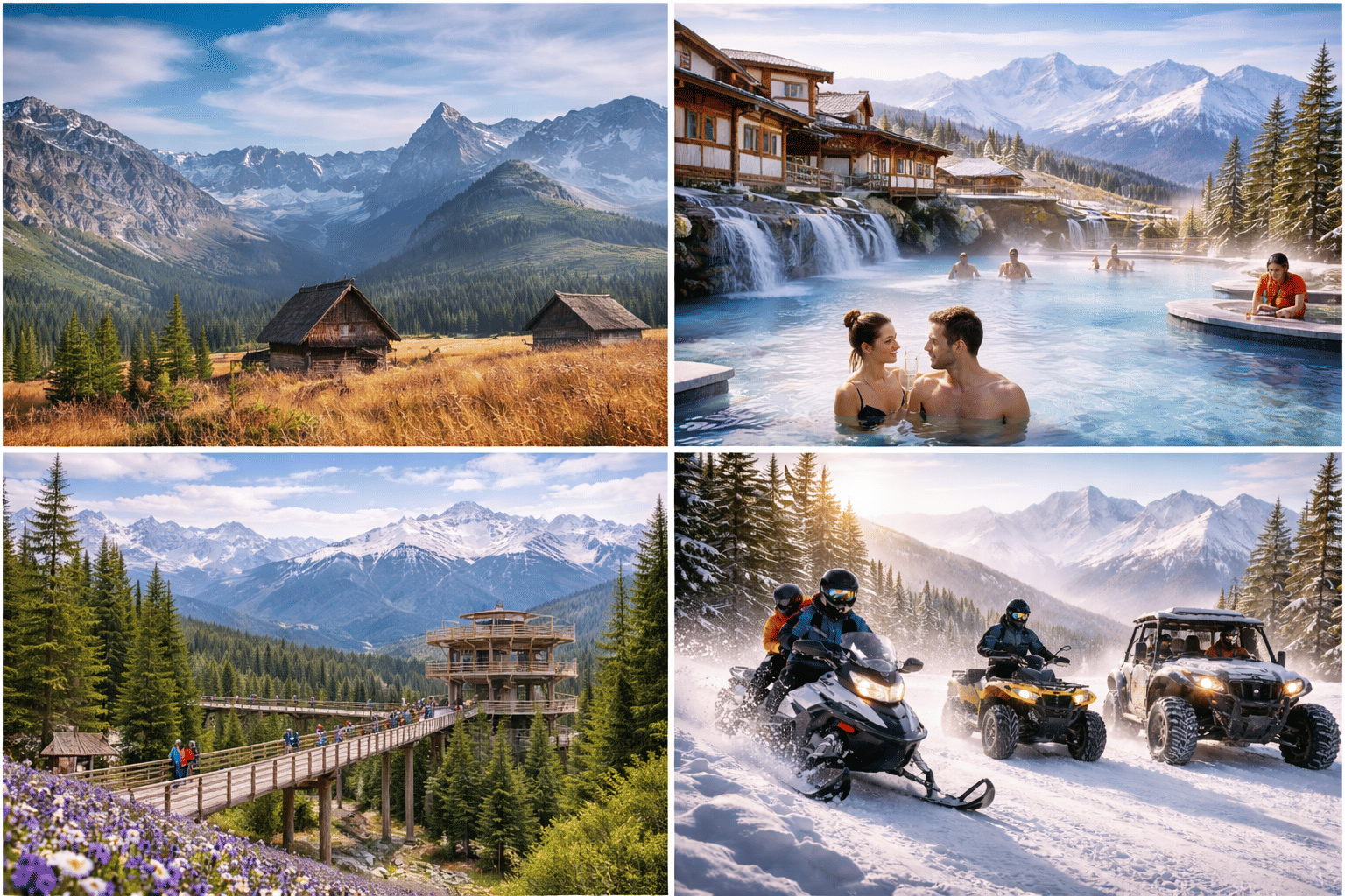 Enjoy a full-day Zakopane adventure featuring an off-road snowmobile, quad or buggy ride, panoramic views from a skywalk treetop walk, local highlander cheese tasting, and relaxing time in thermal pools — all perfectly combined in one unforgettable day